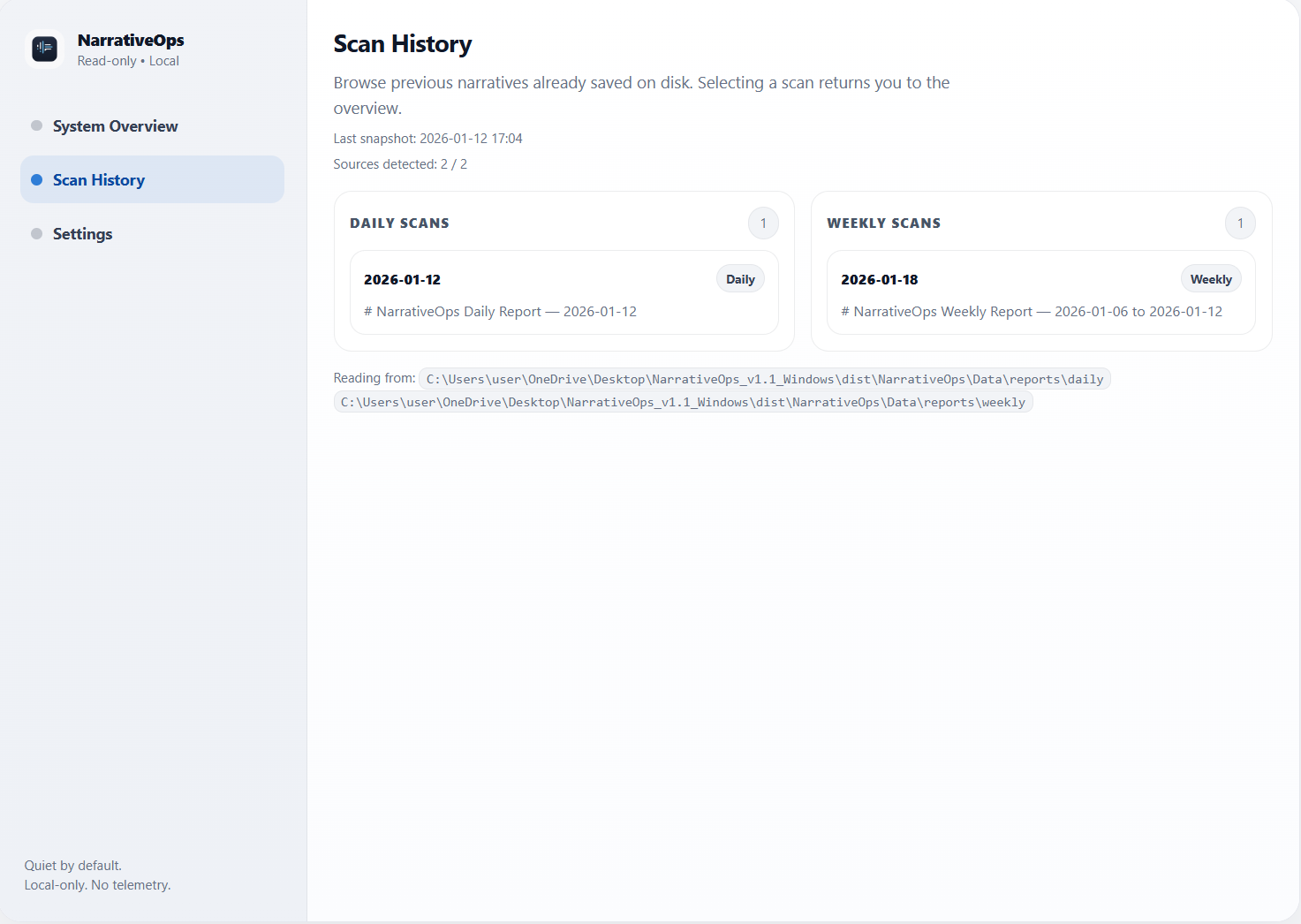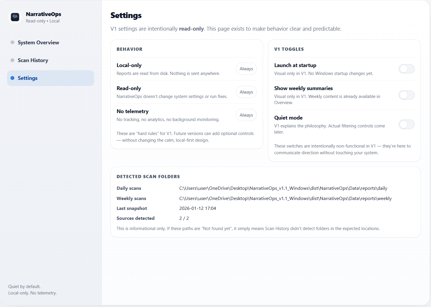 NarrativeOps runs entirely on your machine. No cloud. No tracking. No telemetry.